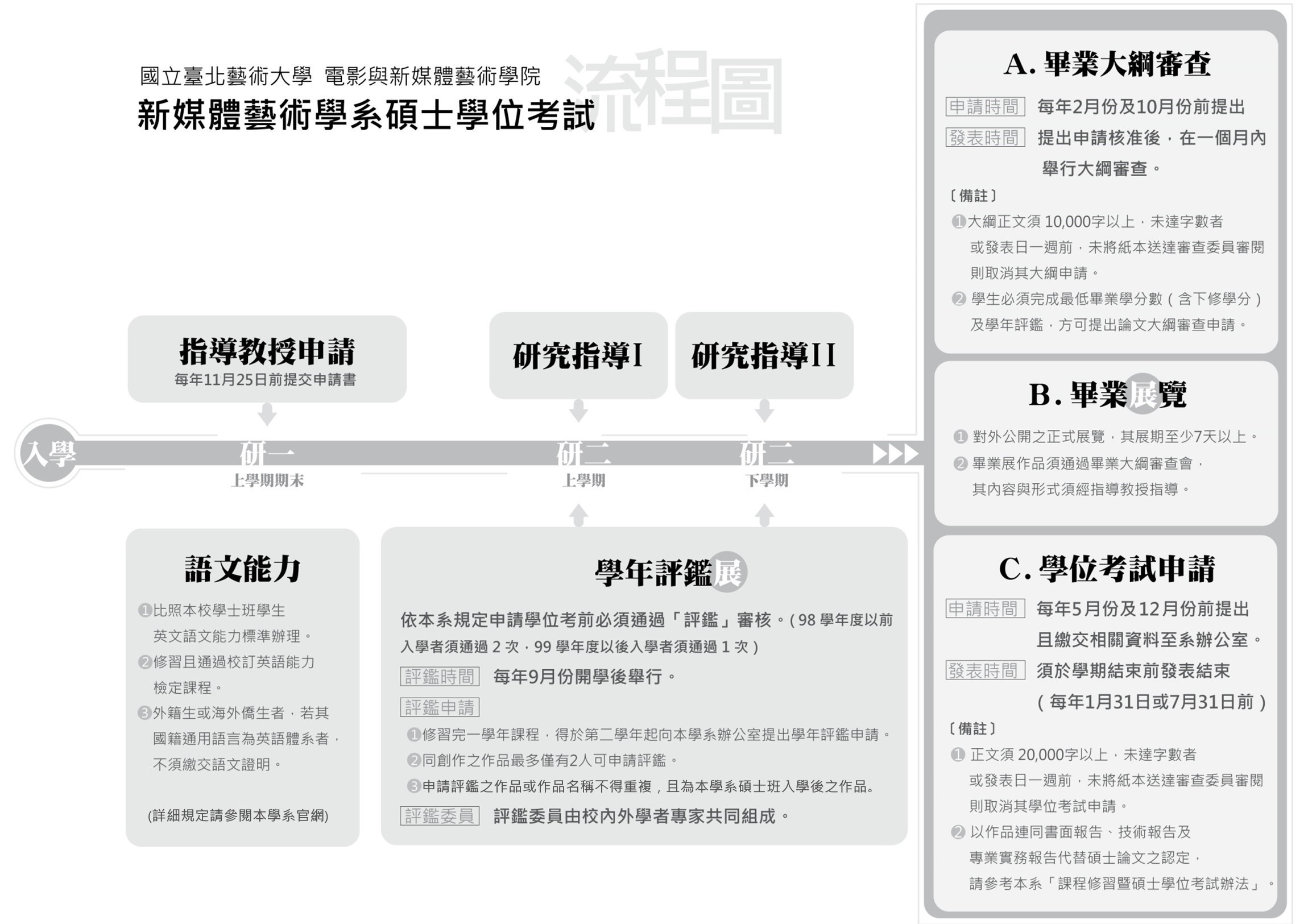 本學系備有新媒體藝術學系碩士班學位考試流程圖,供本學系學生與教師查詢。學生對於學位考試之各項相關事宜應主動與指導教授商議,並向本學系報備,以便掌握學生相關畢業狀態。